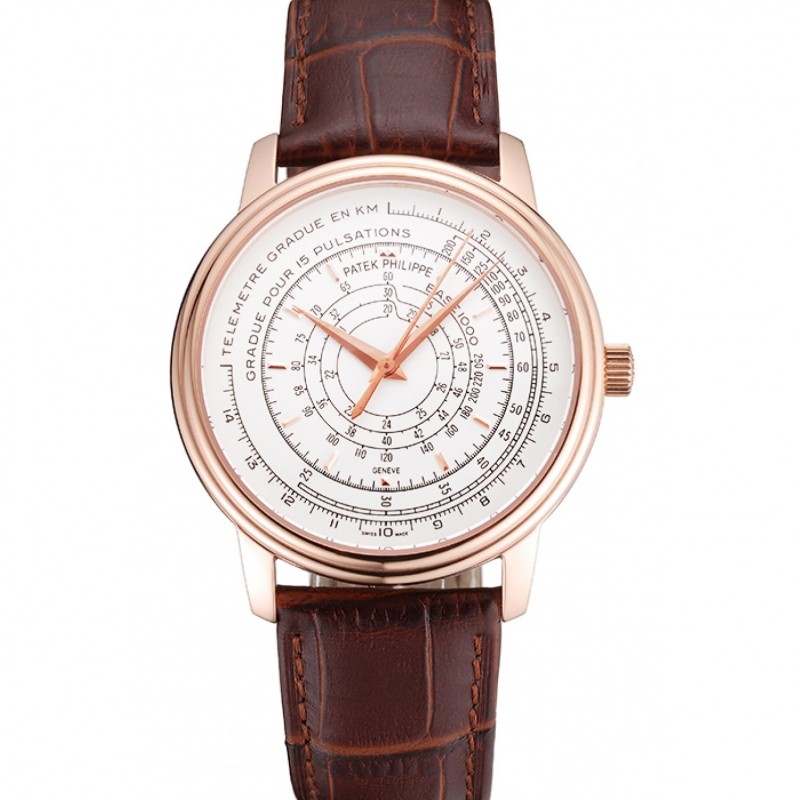 Pas Cher Replique Montre Suisse Patek Philippe multi-échelle chronographe cadran blanc or rose bracelet en cuir brun