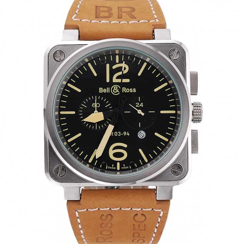 AAA Replique Montre Bell et Ross BR 03-94 Cadran Noir Argent Marron Bracelet en cuir