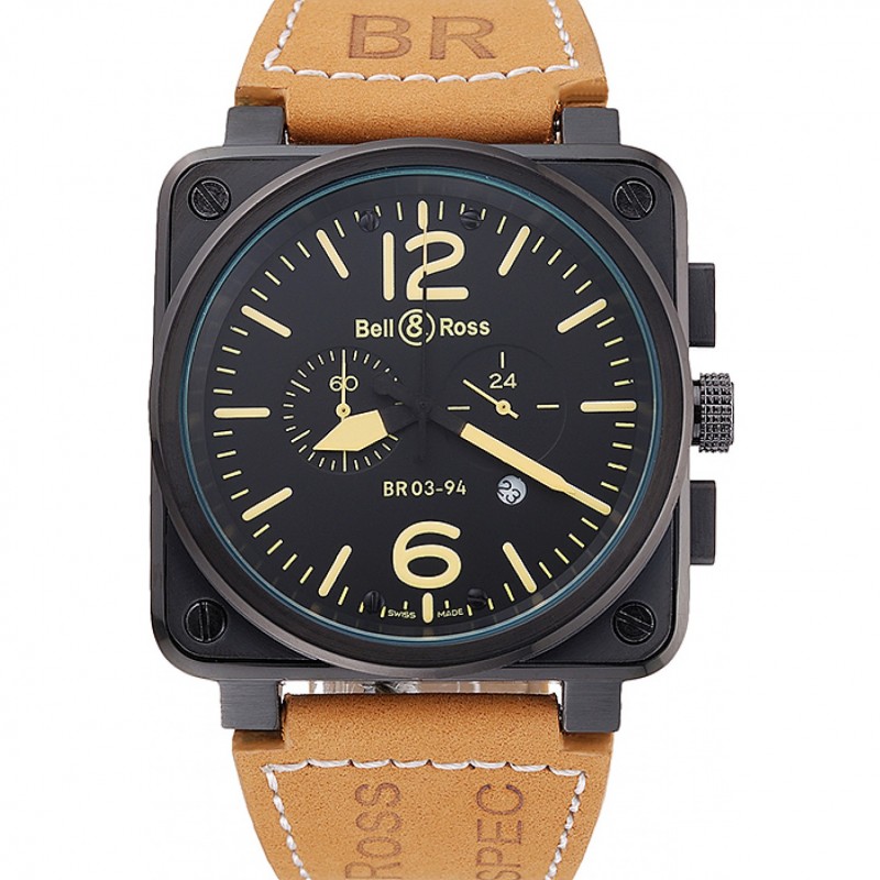 Luxe Replique Montre Bell et Ross BR 03-94 cadran noir boîtier noir bracelet en cuir brun