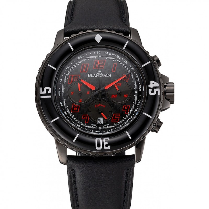Blancpain Fifty Fathoms Commande de vitesse Carbon Dial fibre avec des marques rouges PVD noir cas bracelet en cuir noir 1453775