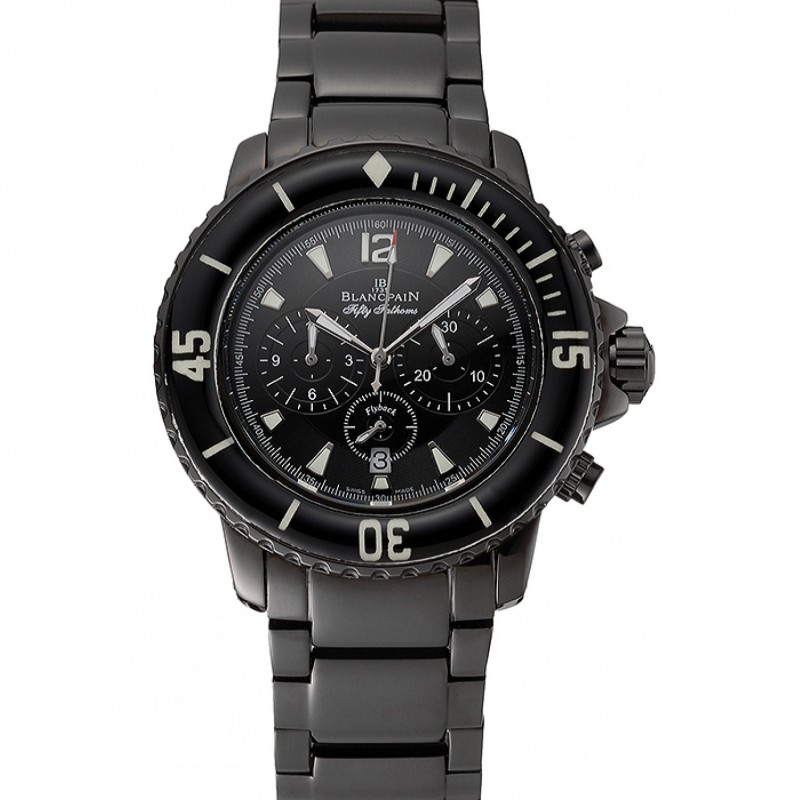 Haute qualité Replique Montre Blancpain Fifty Fathoms Chronographe Flyback cadran noir PVD noir Cas couché et Bracelet 1453770