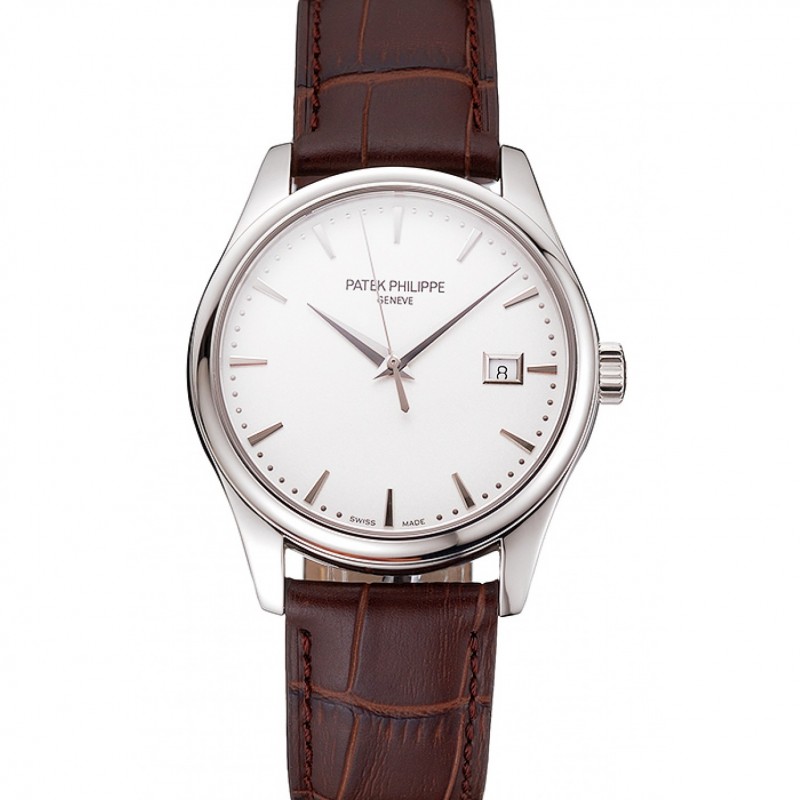 Suisse Patek Philippe Calatrava cadran blanc Boîtier en acier inoxydable bracelet en cuir brun