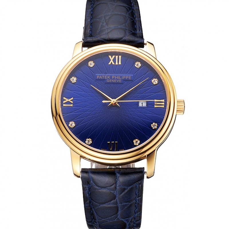 Patek Philippe Calatrava Bleu Date gaufrée Cadran boîtier en or bleu bracelet en cuir