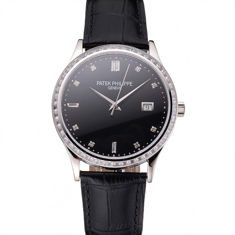 Patek Philippe Calatrava cadran noir diamant heure marques nervuré Bezel Boîtier en acier inoxydable Bracelet en cuir noir