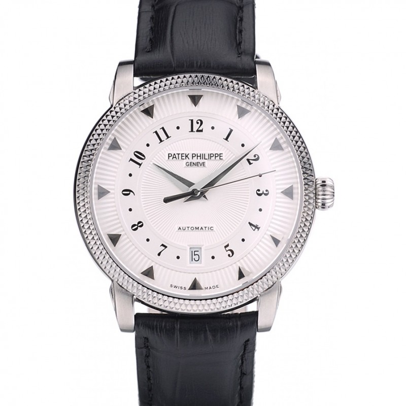 Patek Philippe Bezel nervuré suisse Calatrava cadran blanc bracelet en cuir noir 7657