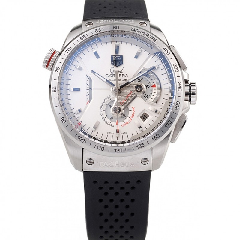 Tag Heuer Carrera Suisse Tachymeter Lunette perforée bracelet en caoutchouc noir cadran blanc