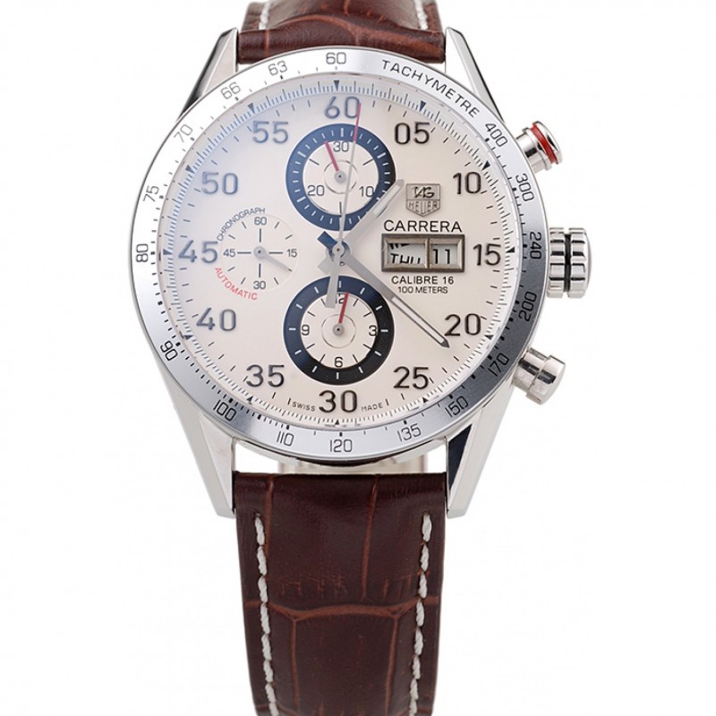 Tag Heuer Carrera Suisse Tachymeter Lunette noir bracelet en cuir brun cadran blanc