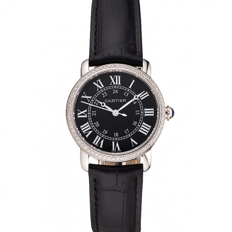 Haut Gamme Cartier Ronde Cadran Noir Diamond Bezel Boîtier en acier inoxydable Bracelet en cuir noir