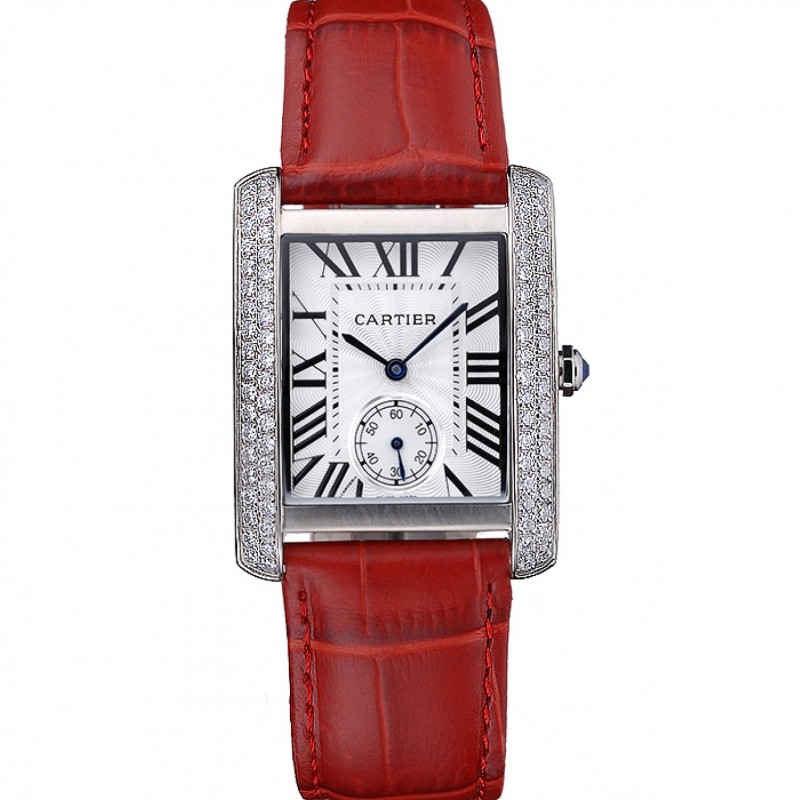 Cartier Tank MC en acier inoxydable diamant cas cadran blanc rouge avec bracelet en cuir 622173