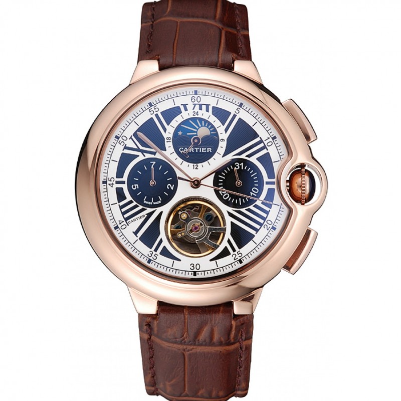 Cartier Ballon Bleu Tourbillon Volant Chronographe Cadran Blanc boîtier en or rose bracelet en cuir brun