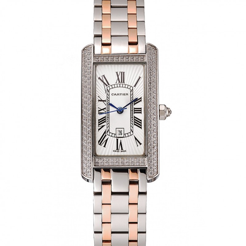 Luxe Replique Montre Cartier Tank Americaine Cadran Blanc Diamond Bezel Boîtier en acier inoxydable Bracelet Deux Tone 1453778