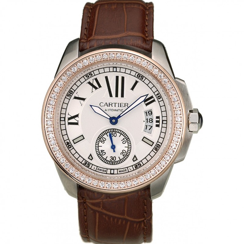 Cartier Calibre cadran blanc Diamants Deux cas Tone Brown Bracelet en cuir
