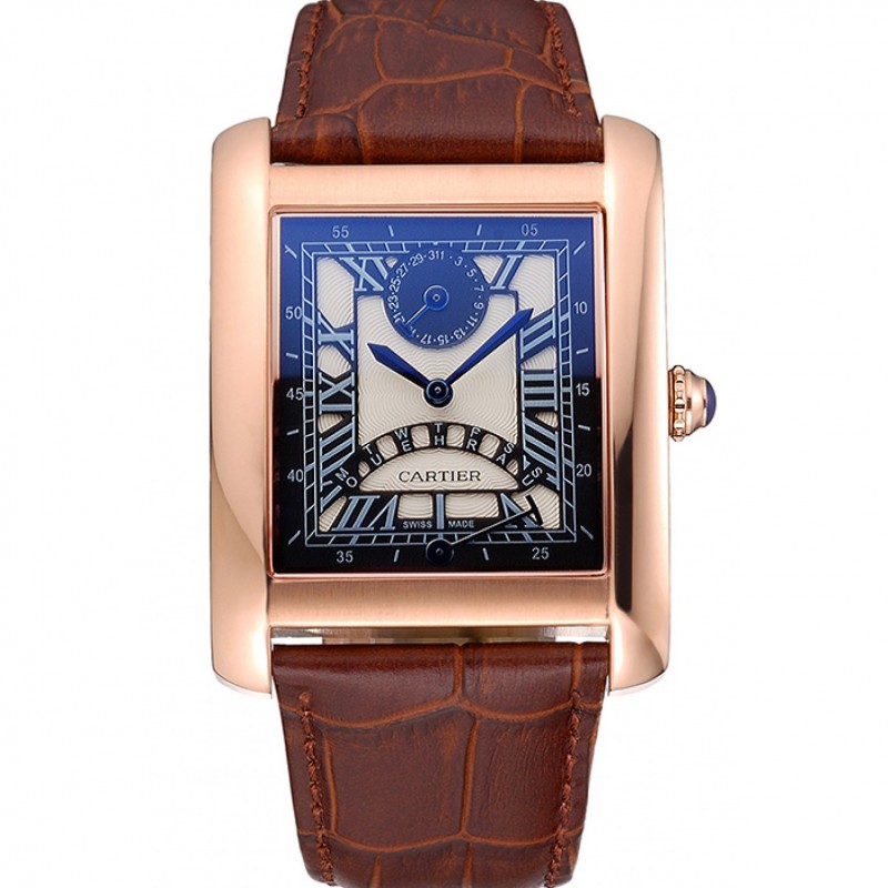 Cartier cas réservoir cadran noir en or rose bracelet en cuir brun 622765
