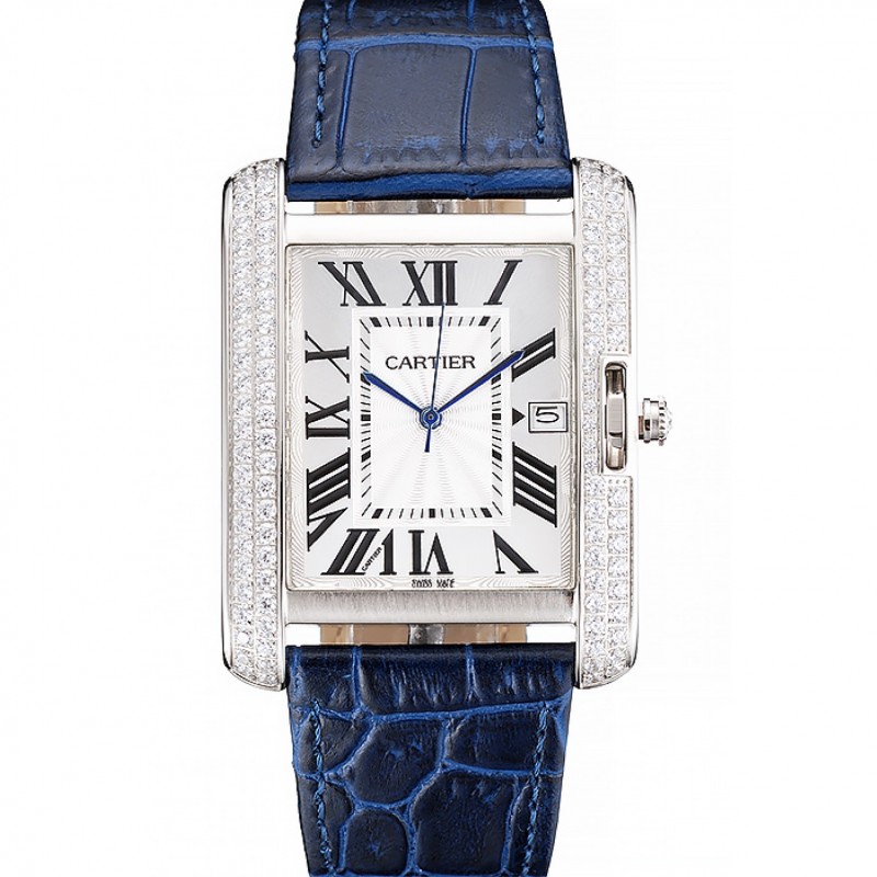 SS Cartier Tank 36mm Diamonds Anglaise cadran blanc Boîtier en acier bleu Bracelet en cuir