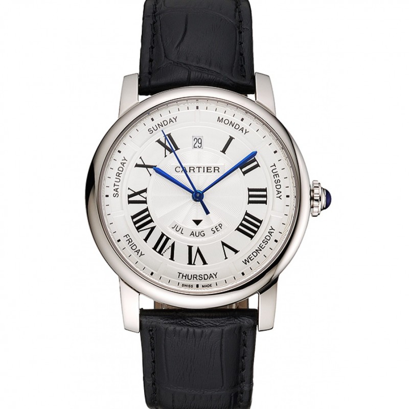 Suisse Cartier Calendrier annuel blanc Rotonde cadran Boîtier en acier inoxydable Bracelet en cuir noir