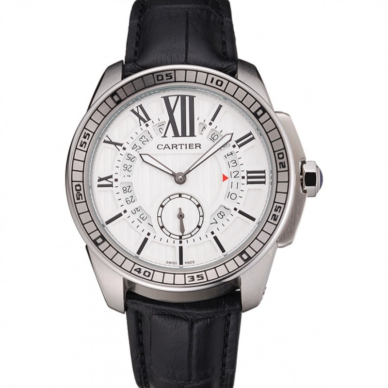 Luxe Cartier Calibre De Cartier Cadran Blanc petites secondes Boîtier en acier inoxydable Bracelet en cuir noir