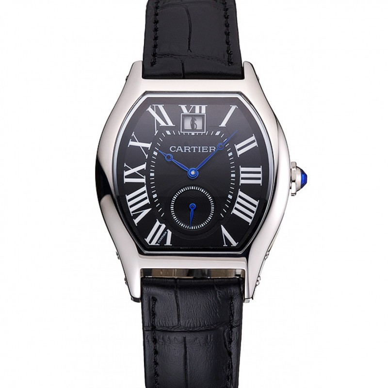 Cartier Tortue Grande date cadran noir Boîtier en acier inoxydable Bracelet en cuir noir