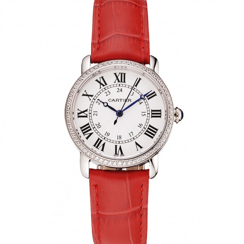 Cartier Ronde Cadran Blanc Diamond Bezel Boîtier en acier inoxydable Bracelet en cuir rouge