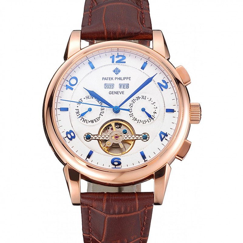 Haute qualité Replique Montre Patek Philippe Perpetual Calendar Tourbillon Cadran Blanc boîtier en or rose bracelet en cuir brun
