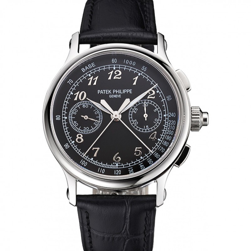 Suisse Patek Philippe Chronographe fendus secondes Cadran Noir Boîtier en acier inoxydable Bracelet en cuir noir