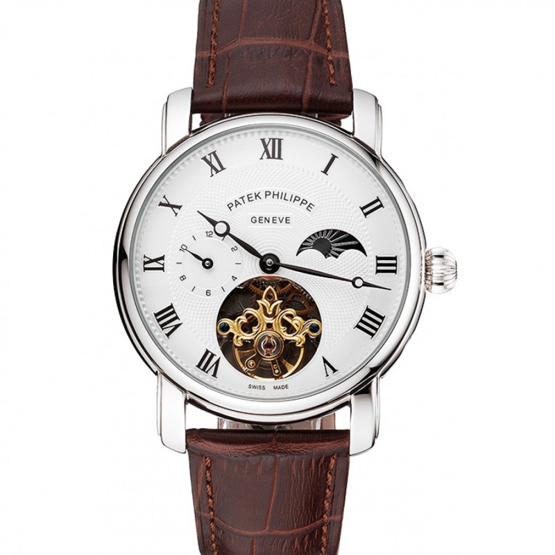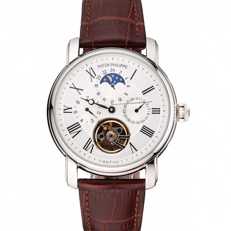 Patek Philippe Complications Moonphase Tourbillon Cadran Blanc Boîtier en acier inoxydable bracelet en cuir brun