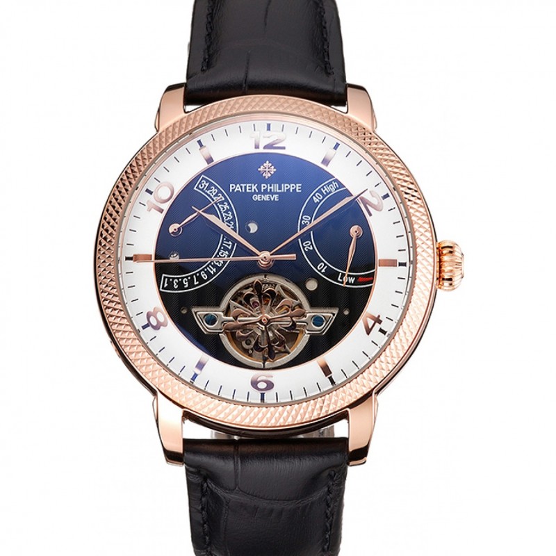 Patek Philippe Classique Tourbillon Réserve de marche en noir et blanc Cadran or rose Bracelet en cuir noir