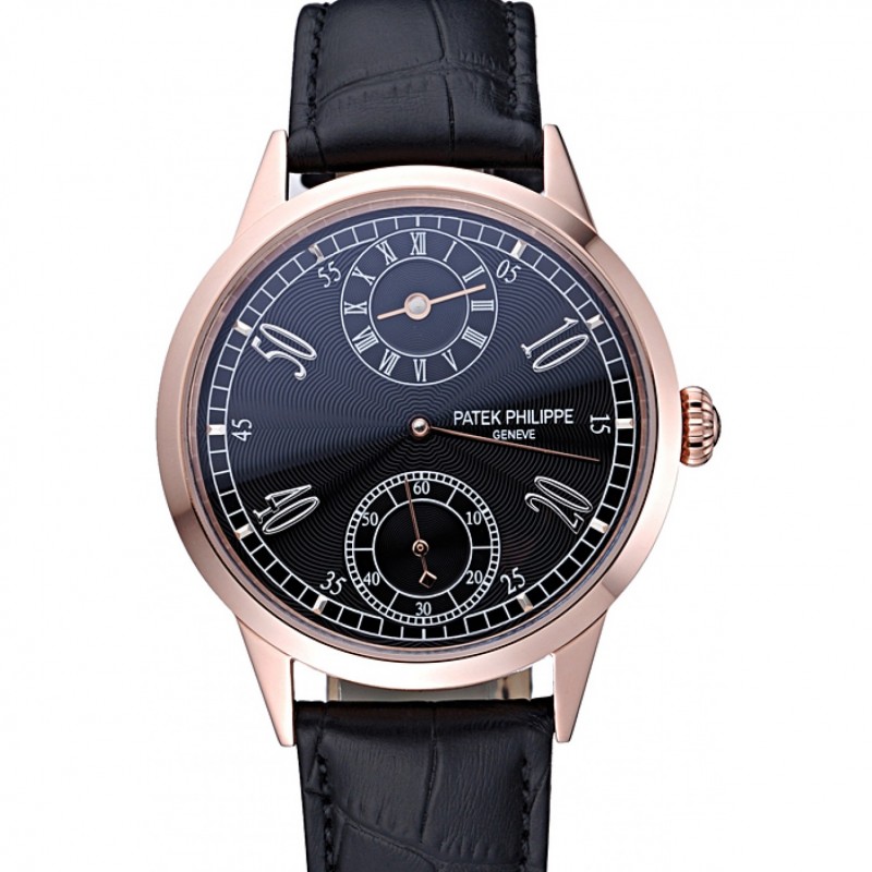 Patek Philippe Geneve Deux cadran noir Dial lunette en or rose bande noire en cuir 622146