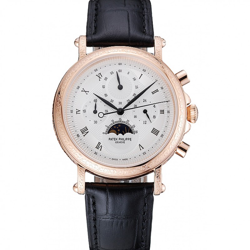 Patek Philippe Grand Complications Cadran Blanc Cas Gravé Or Rose Bracelet en cuir noir 1454144