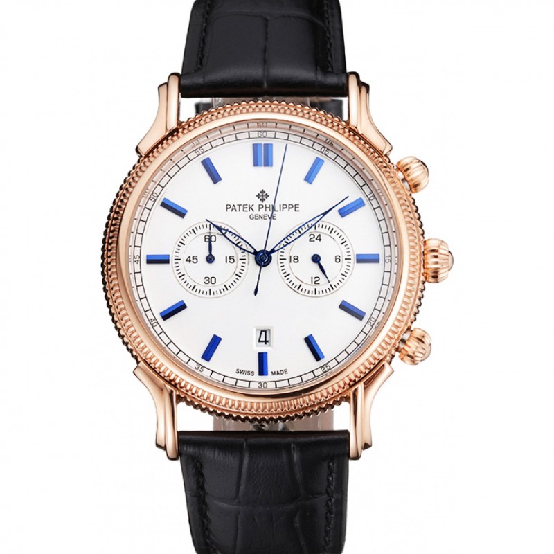 Haut Gamme Patek Philippe Chronographe Cadran Blanc Bleu Marques Or Rose Bracelet en cuir noir