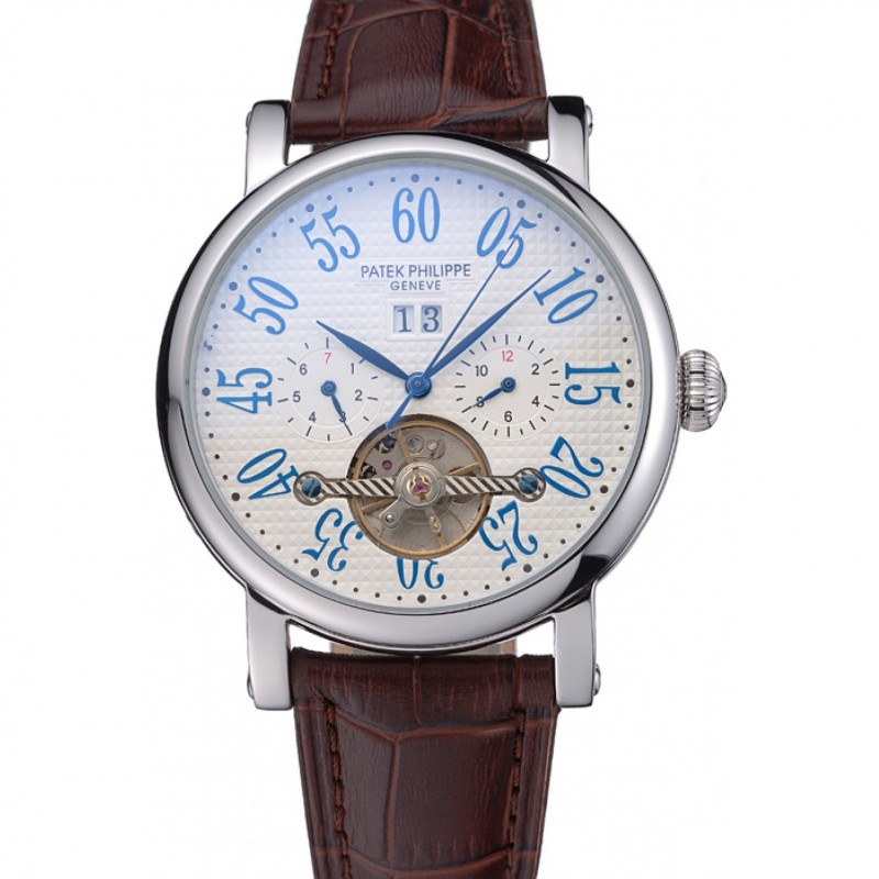 Patek Philippe Grand Complications Moonphase Calendrier perpétuel Tourbillon Cadran Blanc Boîtier en acier inoxydable bracelet en cuir brun