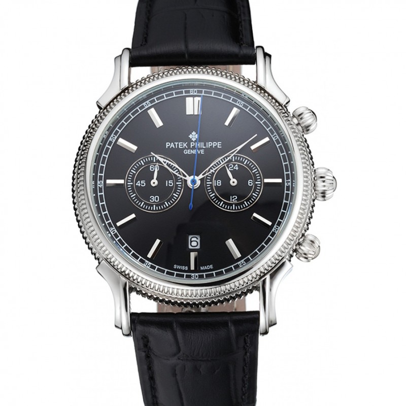 Haute qualité Patek Philippe chronographe cadran noir Boîtier en acier inoxydable Bracelet en cuir noir