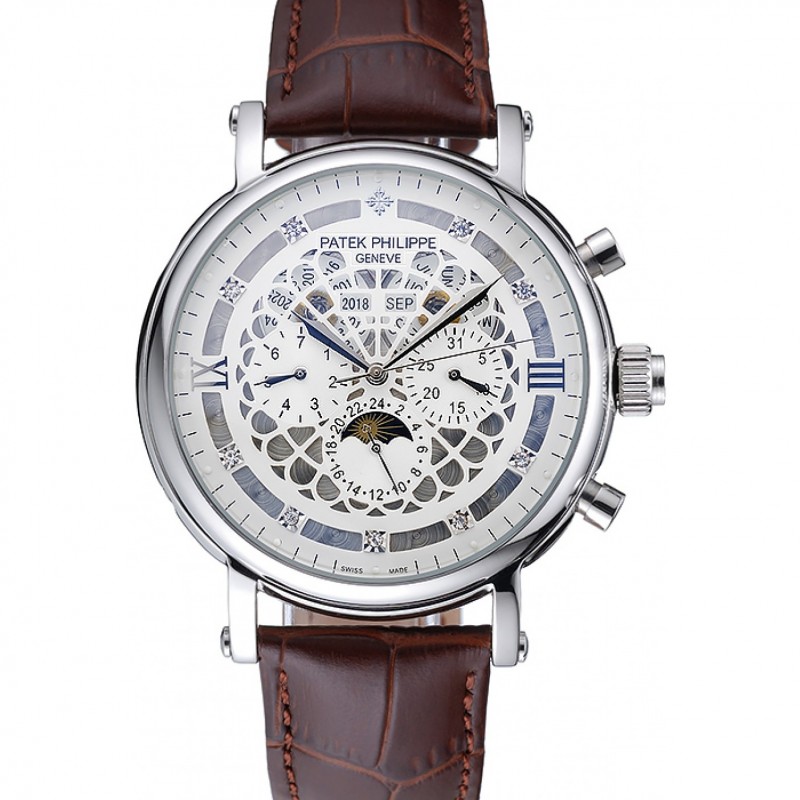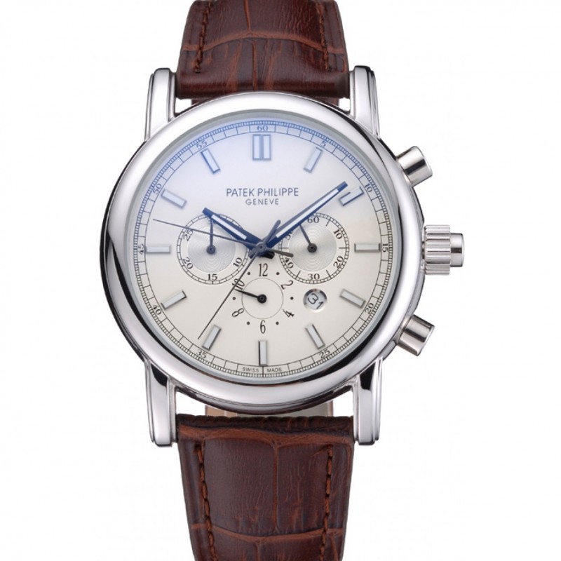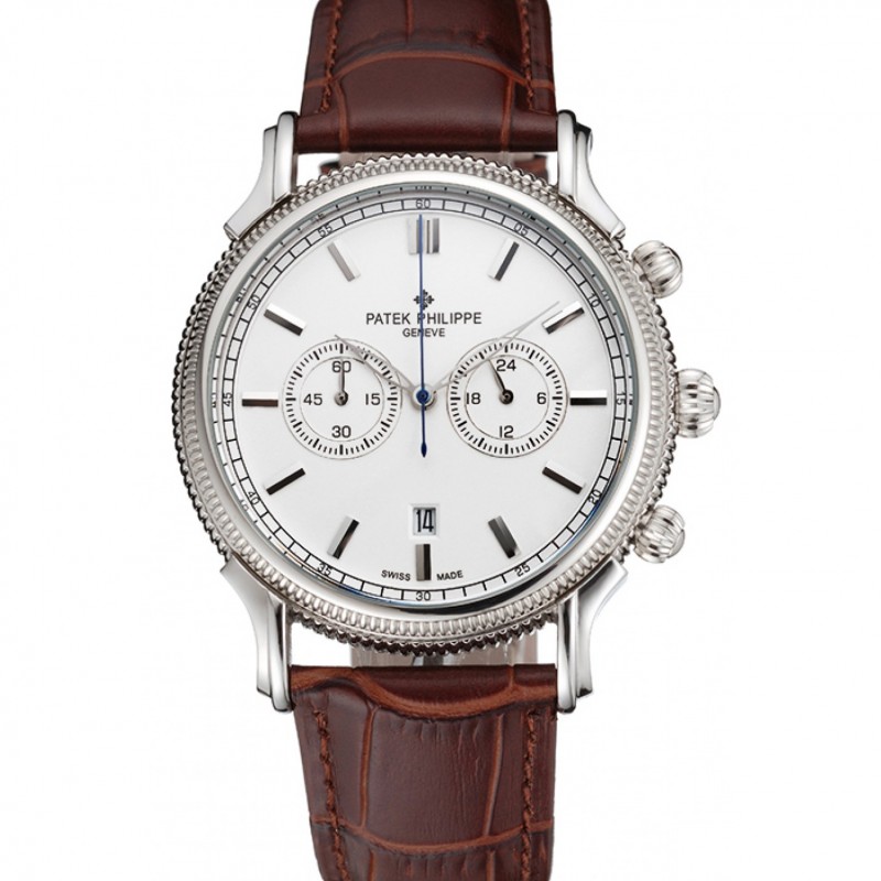 Haute qualité Patek Philippe chronographe cadran blanc Boîtier en acier inoxydable bracelet en cuir brun