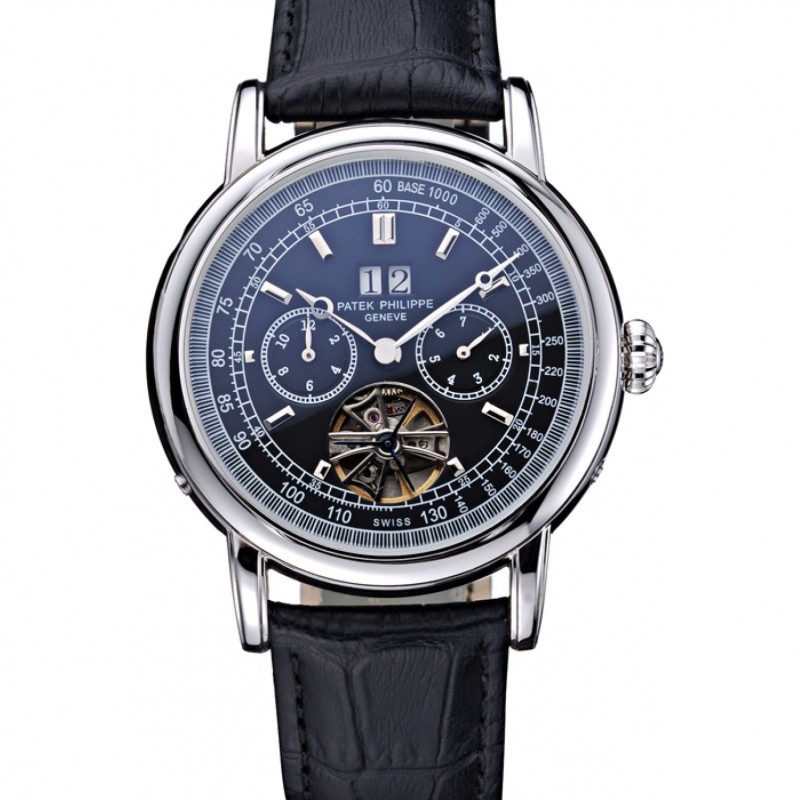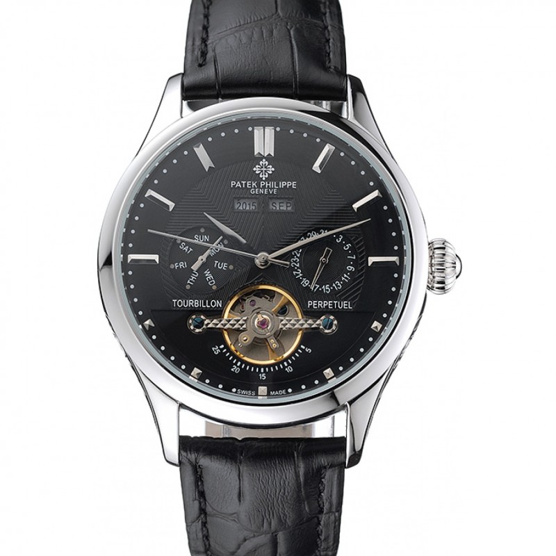 Patek Philippe Day Date Tourbillon Cadran Noir Boîtier en acier inoxydable bracelet en cuir noir 622839