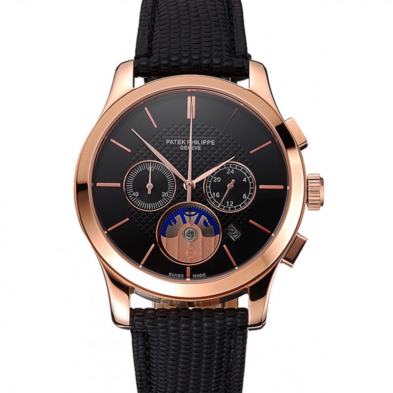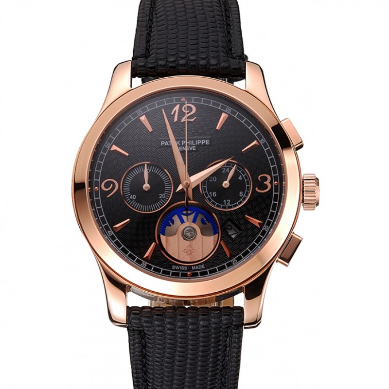 Pas Cher Patek Philippe Chronographe guilloché cadran noir boîtier en or rose Bracelet en cuir noir