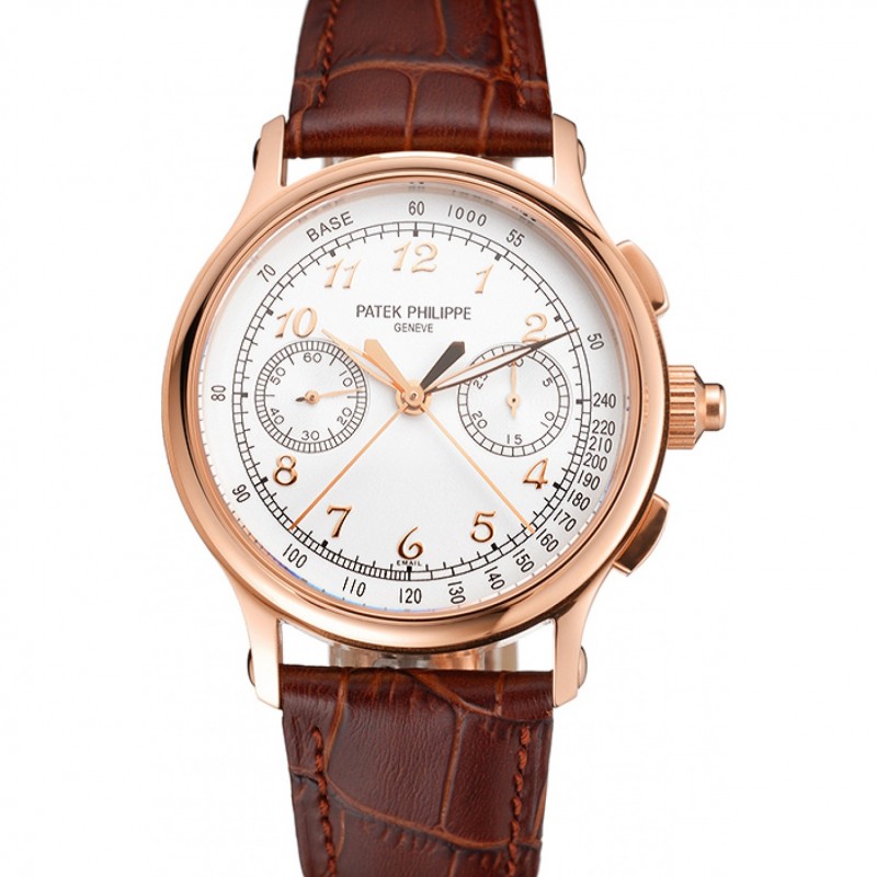 Suisse Patek Philippe Chronographe fendus secondes Cadran Blanc boîtier en or rose bracelet en cuir brun