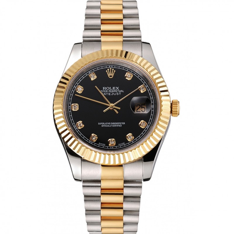 Swiss Rolex Datejust cas cadran noir en acier inoxydable d’or Bezel Bracelet deux tons