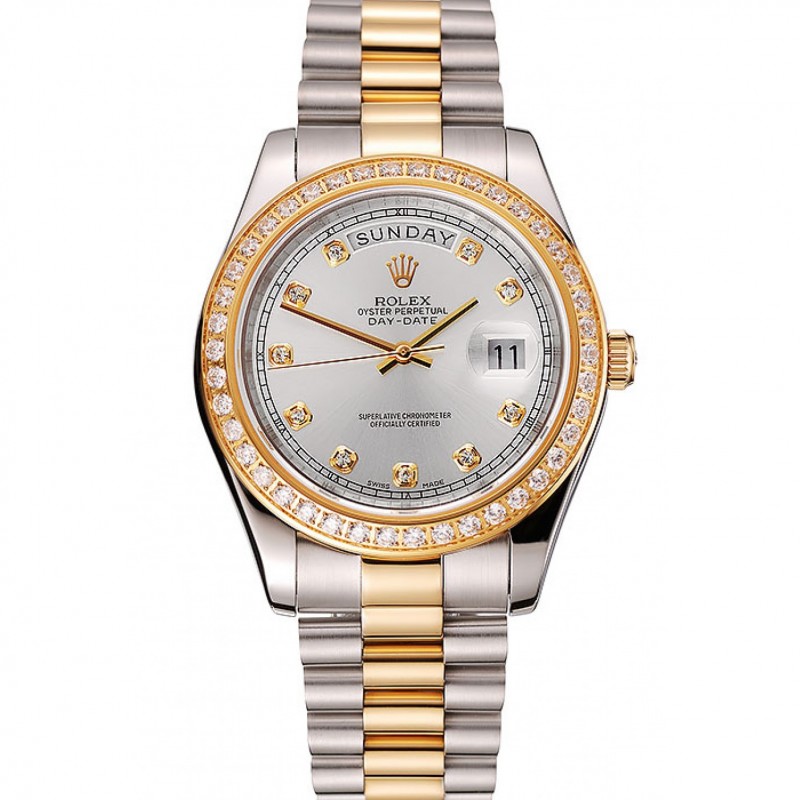 Luxe Replique Montre Day-Date Rolex suisse cadran blanc diamant d’or de cas de deux tons Bracelet en acier inoxydable 1453971