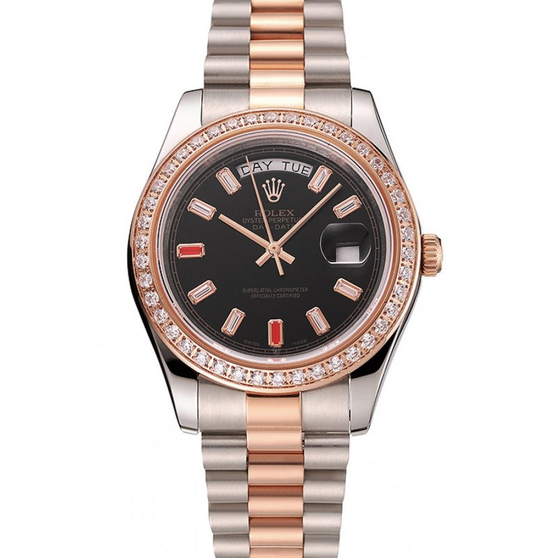Haut Gamme Diamants suisse Rolex Day-Date Et Rubies cadran noir en or rose et staineless Bracelet en acier 1454106
