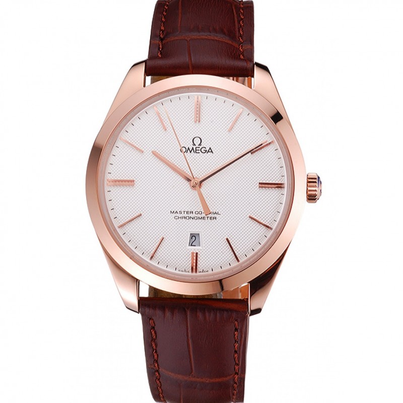 Haut Gamme Replique Montre Omega Tresor Maître Co-Axial Cadran Blanc boîtier en or bracelet en cuir brun