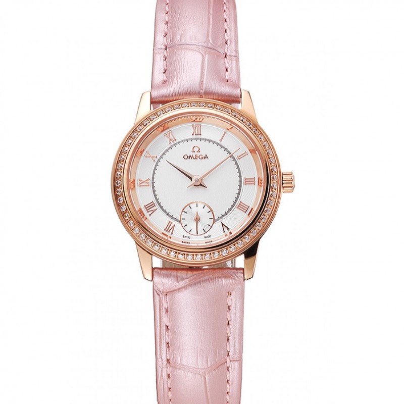 SS Replique Montre Omega De Ville Prestige petites secondes Cadran Blanc Diamond Bezel Or Rose rose Bracelet en cuir