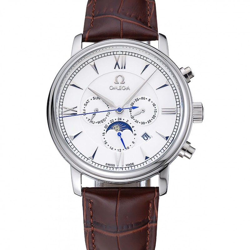 Omega De Ville Moonphase Cadran Blanc Argent Marron Bracelet en cuir 1454226