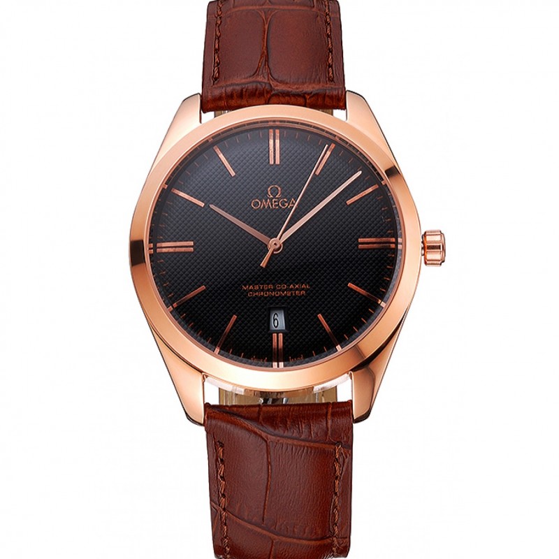Omega Tresor Maître Co-Axial cadran noir boîtier en or rose bracelet en cuir brun