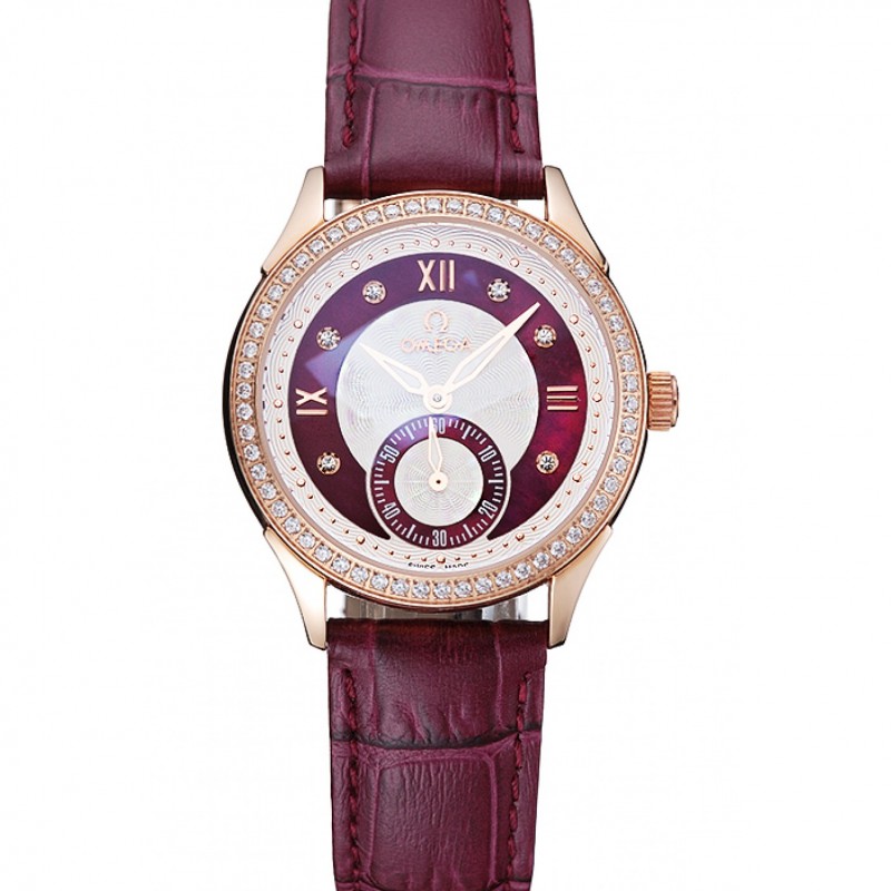 Omega DeVille Prestige Rouge foncé Cadran de diamant d’or Cas rouge foncé Bracelet en cuir 1454125