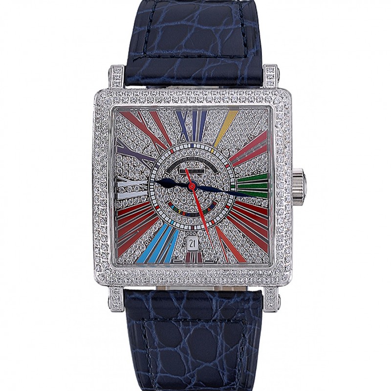 AAA Replique Montre Franck Muller Master Square Couleur Rêves de diamants Cadran de diamants boîtier bleu bracelet en cuir 622359