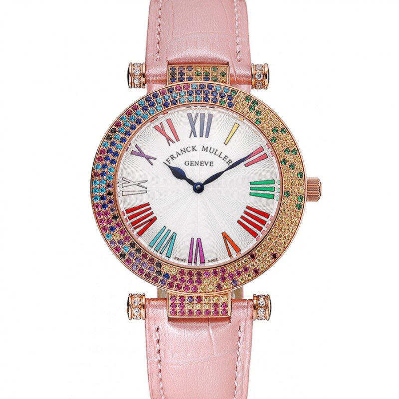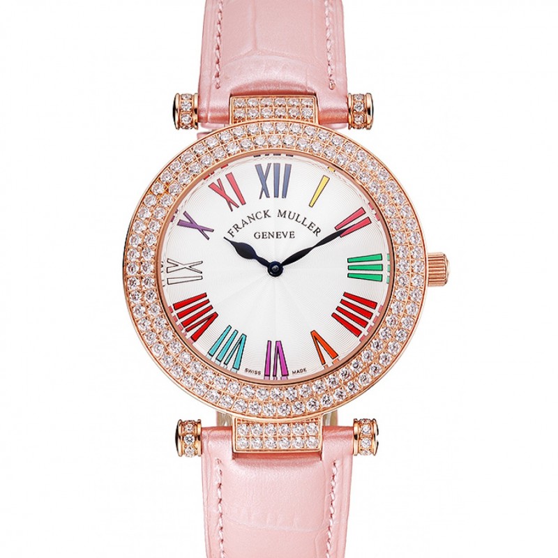 Franck Muller Double Mistery Ronde Cadran Blanc Or Rose Rose clair Bracelet en cuir