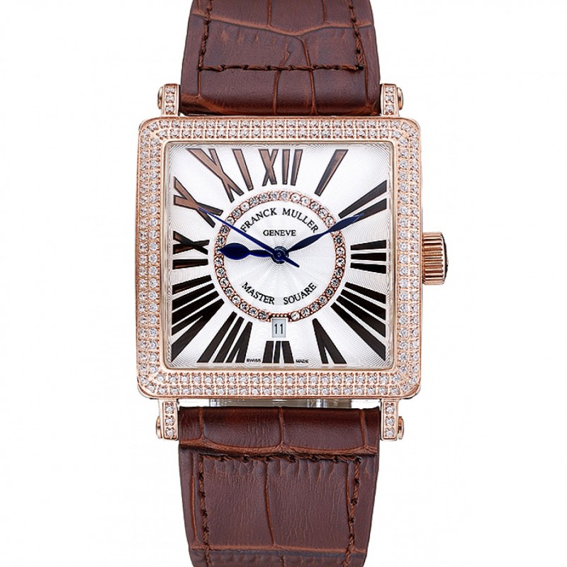 Franck Muller Master Square Diamant Incrusté Bezel Or Rose Brown Croco Bracelet 80283
