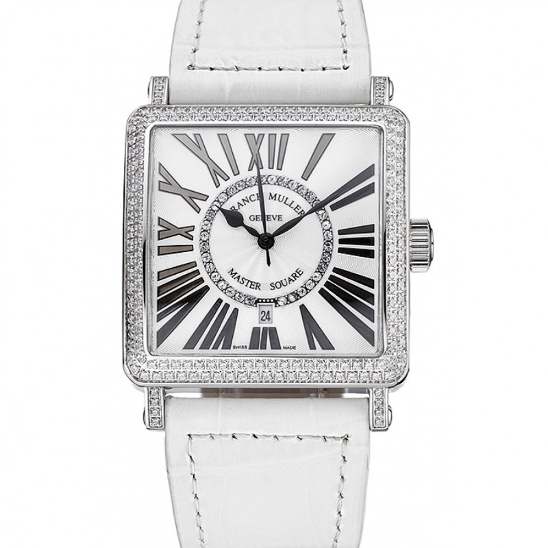 Franck Muller Master Square Diamant Incrusté Lunette en acier inoxydable Blanc Croco Bracelet 80284