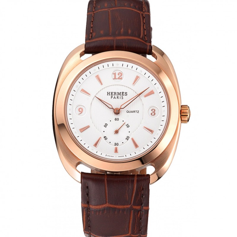Hermes Dressage cadran blanc or rose bracelet en cuir brun