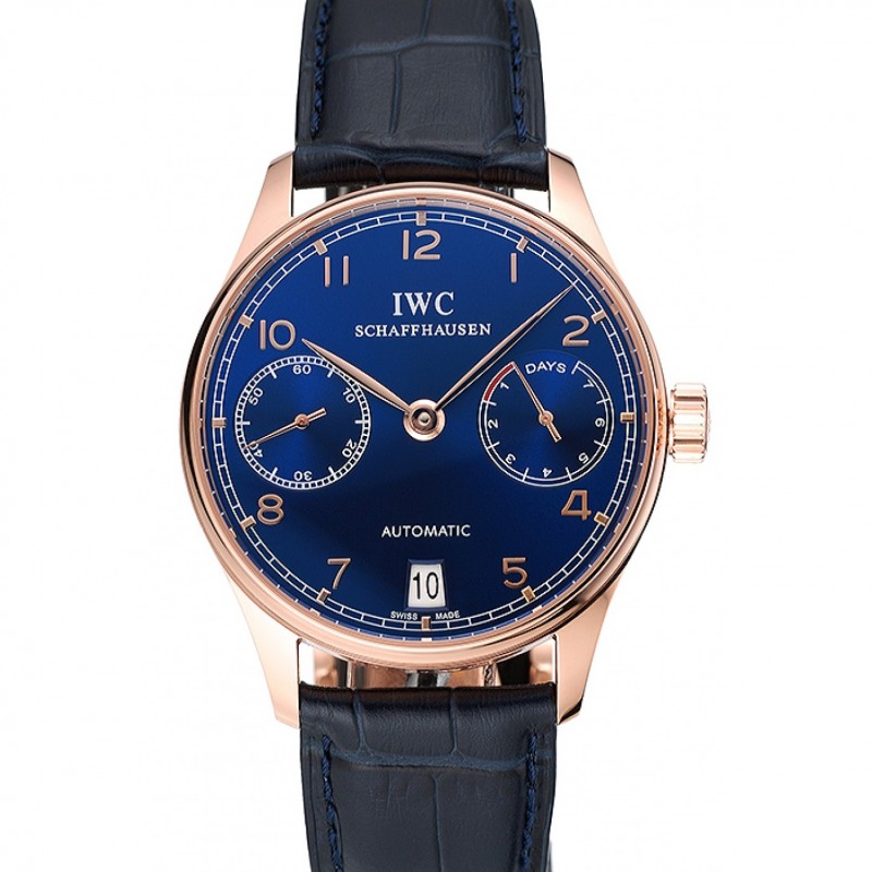 Gold Swiss IWC Portugaise cadran bleu cas bleu Bracelet en cuir 1453919