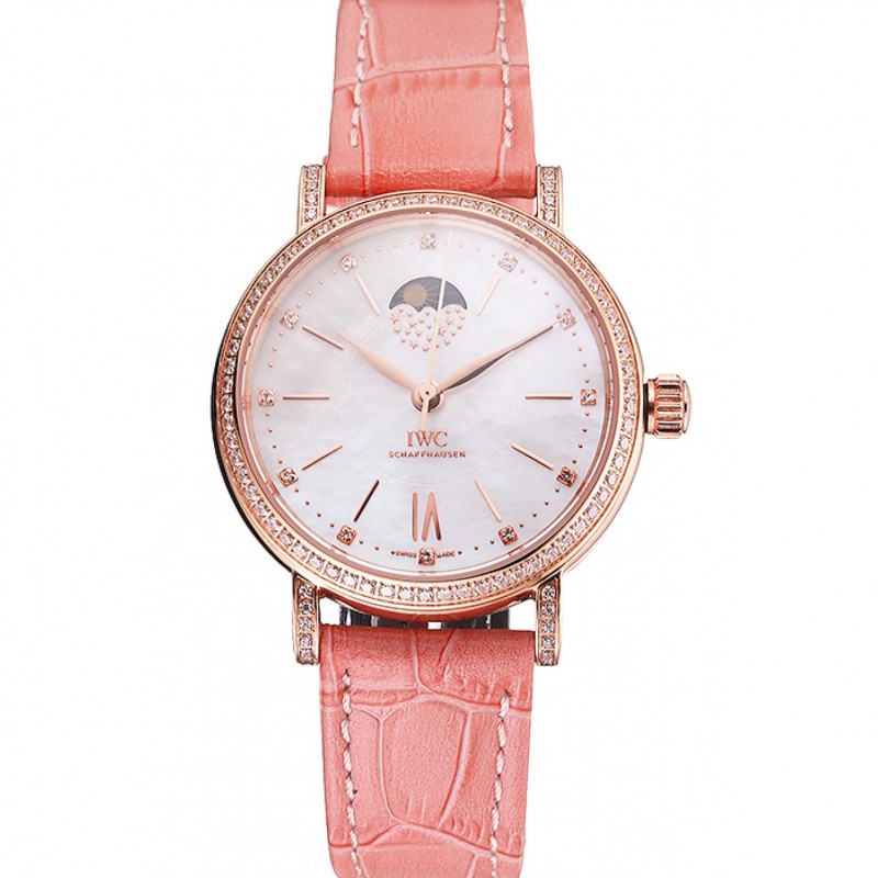 IWC Portofino Phase de Lune cadran argenté diamants boîtier en or rose lunette rose Bracelet en cuir